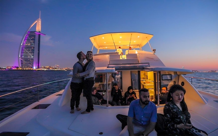 Enjoy a cruise on a yacht with lunch included from 5:30 PM to 7:30 PM. Experience views of Dubai Eye, JBR, Harbour, Lagoon, Burj Al Arab, and Marina.